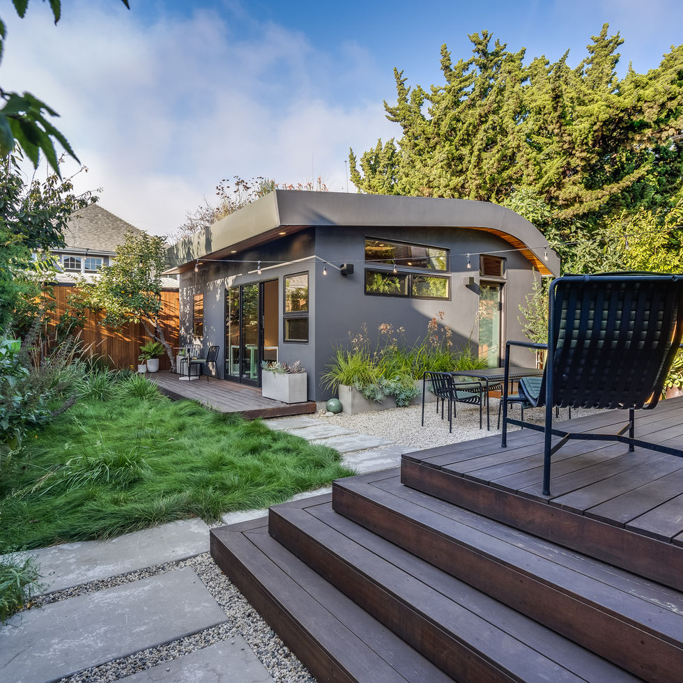 This client brought me in mid-construction of their new backyard ADU to help shape a garden that could do it all: provide a communal space for outdoor dining, a soft spot for kids to play or relax, and support local wildlife. We kept the layout simple but intentional, maximizing function and ecological value. A compact native lawn offers a gentle landing zone, while surrounding beds are filled with pollinator friendly plants. The rooftop ADU became a highlight: a vibrant pollinator habitat featuring grasses, buckwheats, succulents, and colorful perennials. In the first year alone, we watched ten monarch caterpillars hatch into butterflies, a joyful sing that the garden is alive and working.